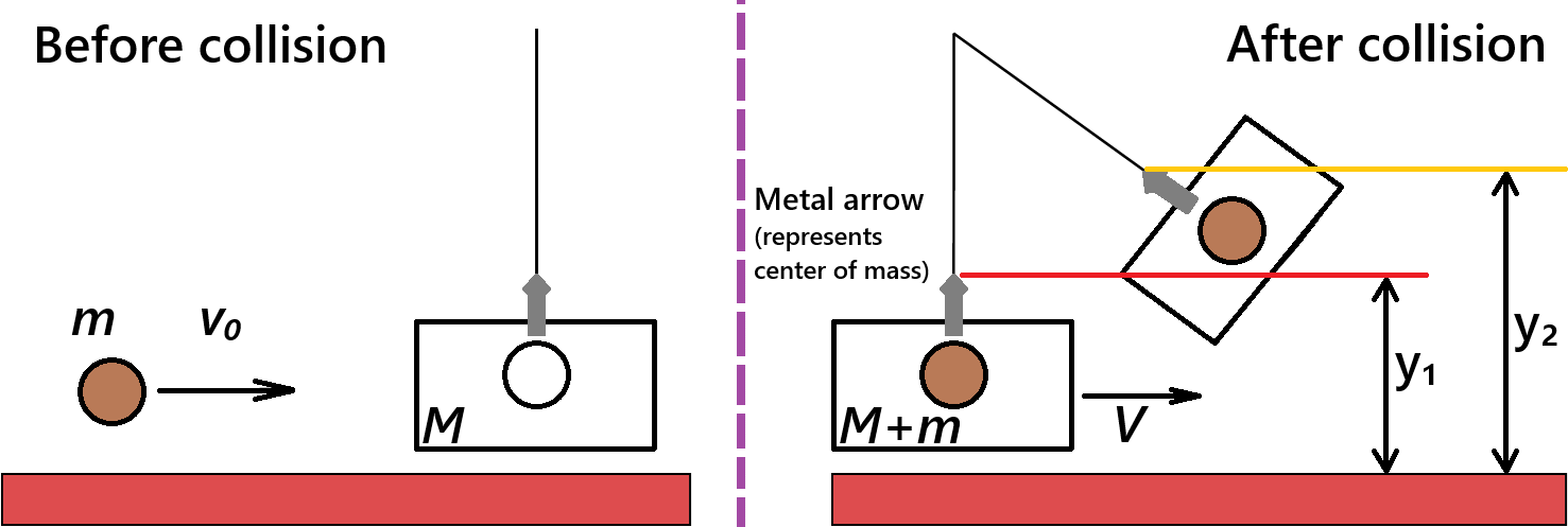 As illustrated in the left image in Fig. 47, before the collision, the projectile is in motion horizontally towards the stationary pendulum. After the collision, the projectile is imbedded in the pendulum and the pendulum is moving along the arc as shown in the right image of Fig. 47.