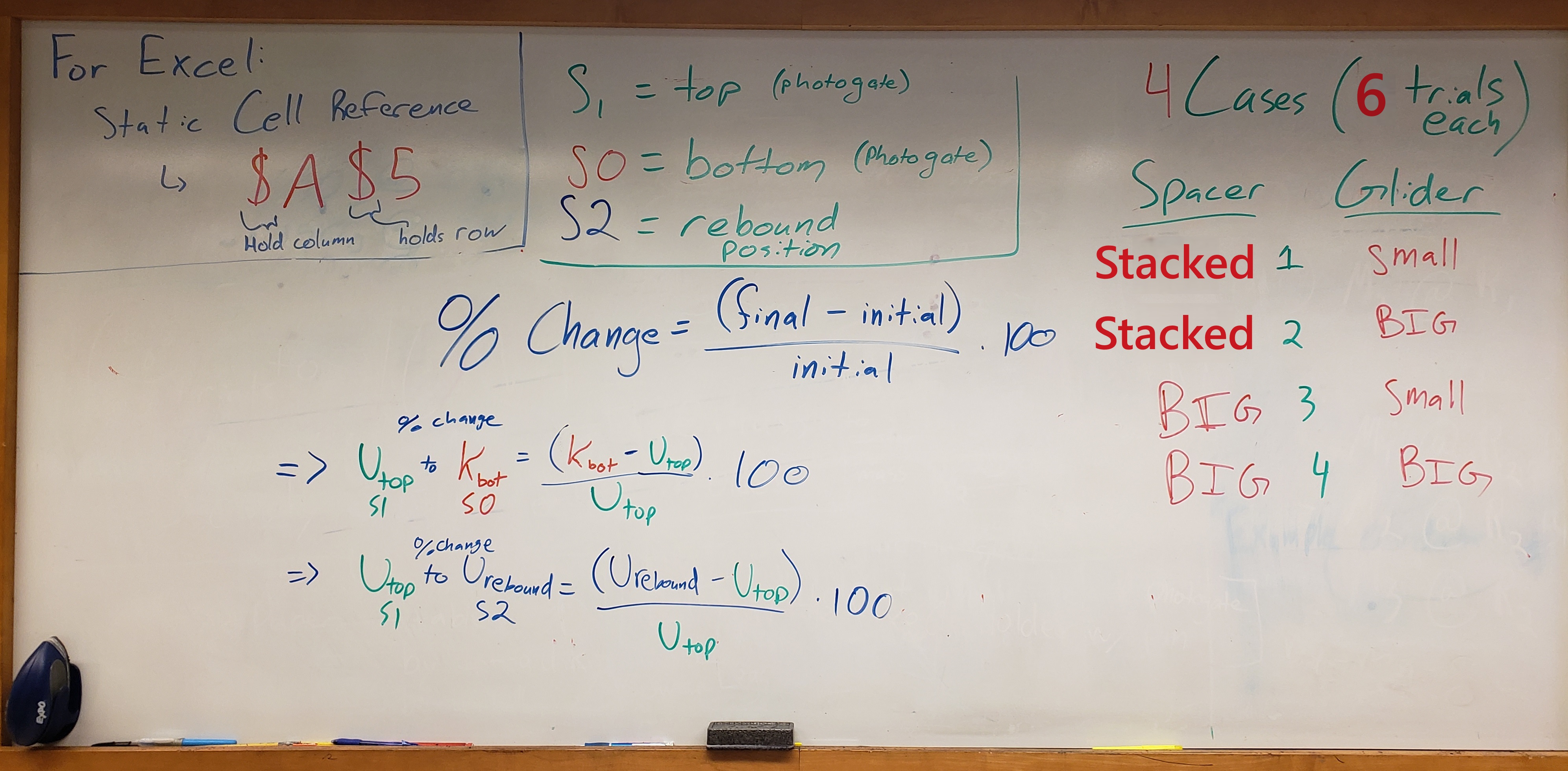 f. Calculate \(\%\text{ Change}_{U_{\text{top}}\text{ to }K_{\text{b}}}\), the percent change (62) in mechanical energy from the initial release point \(s_1\) to the bottom photogate position \(s_0\) (Note: If you change the Excel number format of this cell to