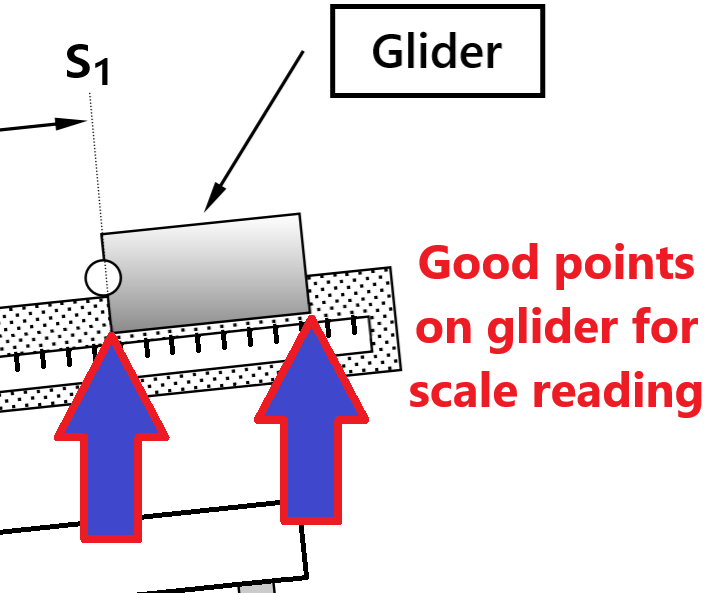 Take a look at the gliders and determine a convenient point on the glider to use with the scale (\(\sim2.5\) meter ruler) attached on the side of air track. It doesn’t matter what point on the glider you choose, only that you be consistent and use the same point for all determinations of distance along the track \(S\) for that glider. A convenient point is the lower front or rear corner of the glider since it is a clear point on the glider that will overlap or be quite close to the length scale on the track itself (see Fig. 45).