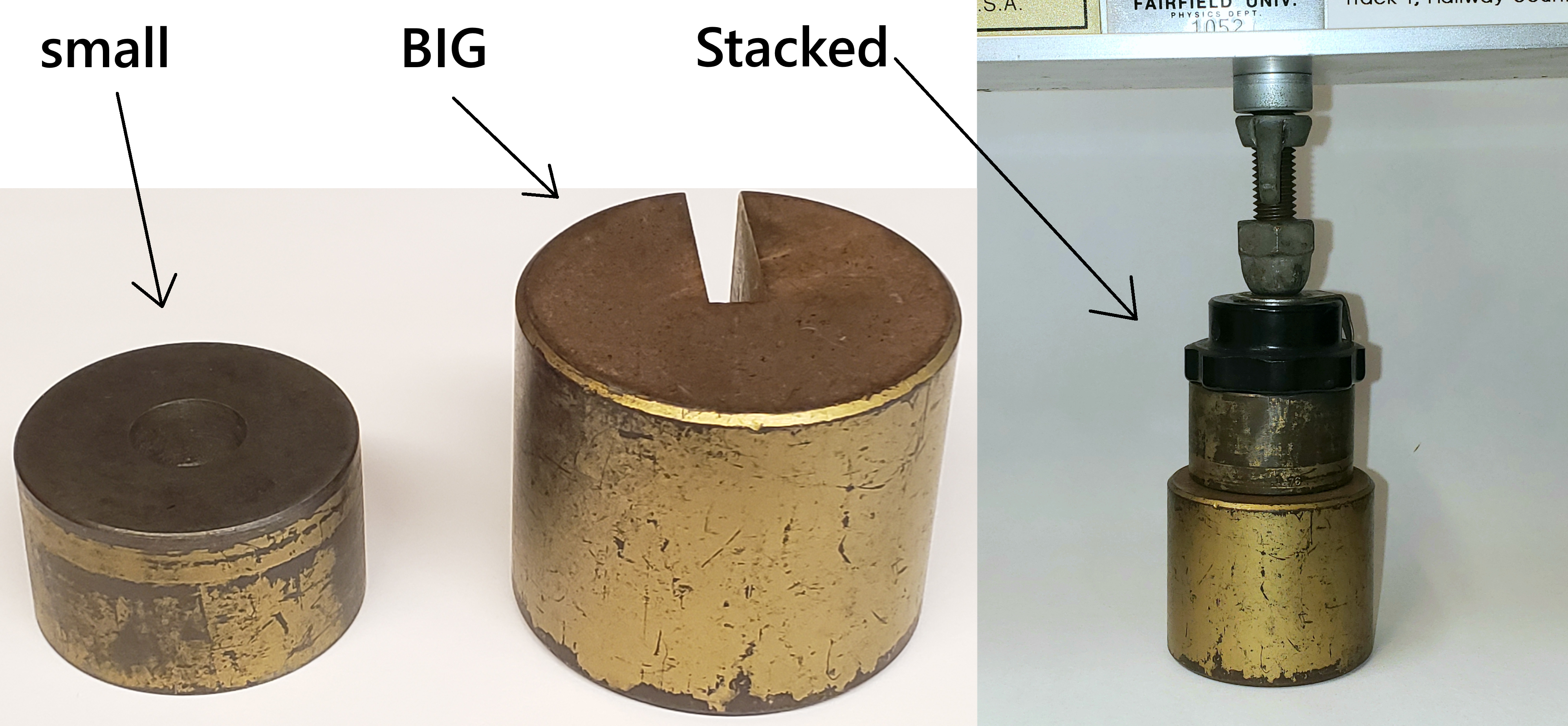 Measure and record the heights, \(H\), of each of the two spacers (big slotted masses) with the provided Vernier caliper. If you need a refresher on using Vernier calipers, see Reading the Vernier scale. Since we’ll be stacking the spacers for some of the cases today, include a stacked spacers value in your common data table for easier use of the height later.