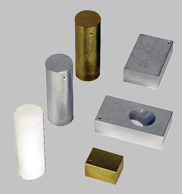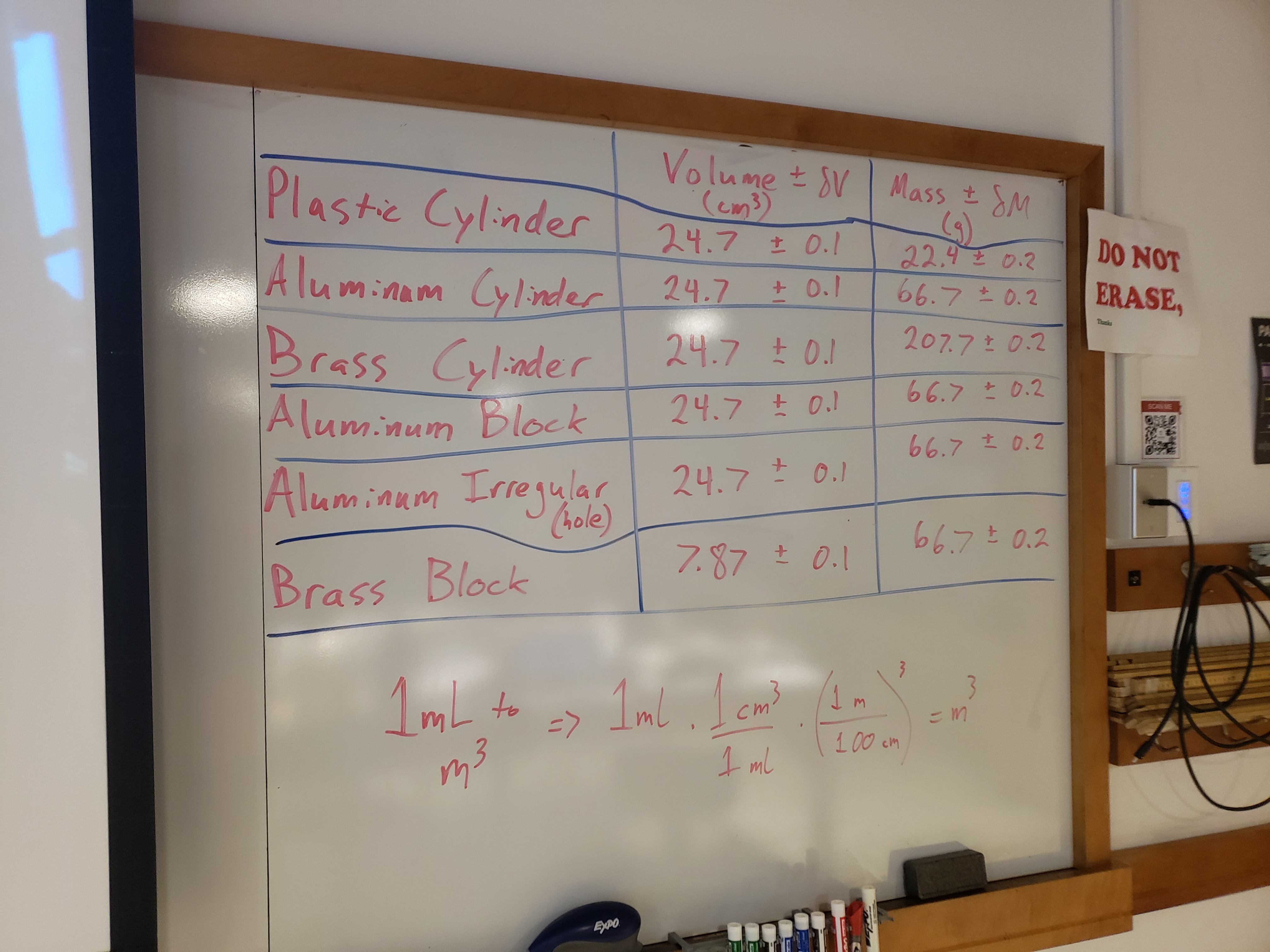 Using the calipers, measure the dimensions of the 3 cylinders and the 2 blocks (Fig. 45). Remember to divide the diameter by 2 to get the radius, \(r\). Calculate the volume \(V\) of these objects \(V_\text{cylinder} = \pi r^2 h\) and \(V_\text{block} = lwh\)