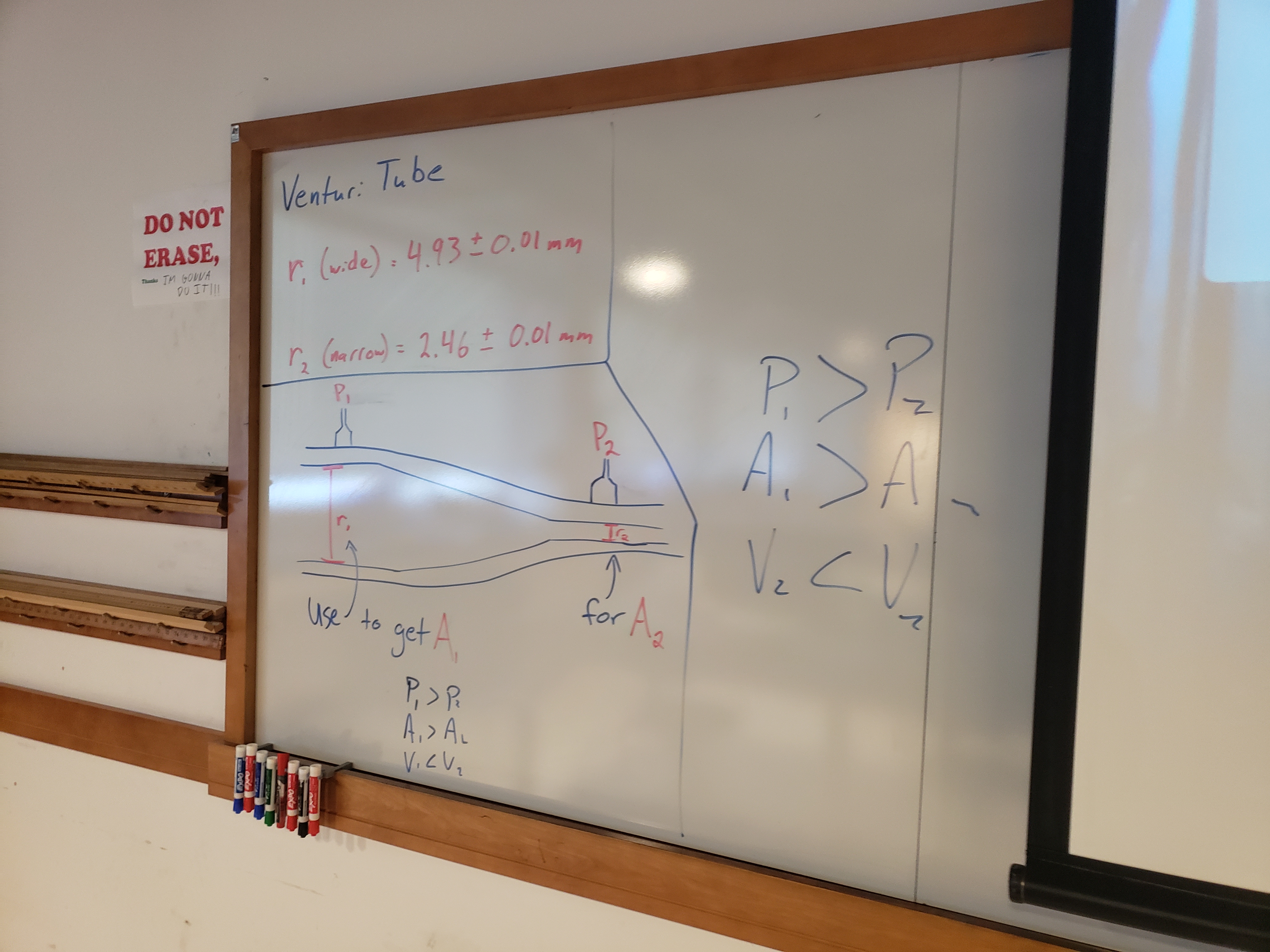 In our experiment, we will assume we don’t know the pressure at the constriction \(P_2\), and will use the Continuity and Bernoulli equations to determine theoretically what \(P_2\text{ theoretical}\) should be and compare to the actual value \(P_2\text{ actual}\) as measure by our pressure sensor.