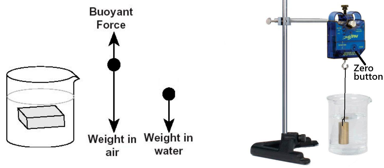 Fig. 42 Left) Force diagram. Apparent weight in water is the difference of weight in air and buoyant force. Right) Force sensor measuring apparent weight of object in water.#