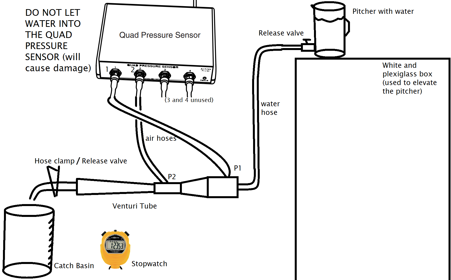 NOTE: The pressure sensor hoses are to have only (or mostly) air such that water does not reach the pressure sensor. To avoid water getting up the air hoses, ensure the Venturi tube is positioned with the air hoses pointed upward. After passing through the Venturi tube, the water will flow into a catch basin. There will also be a stopwatch to measure flow-rate during the first part of the experiment.