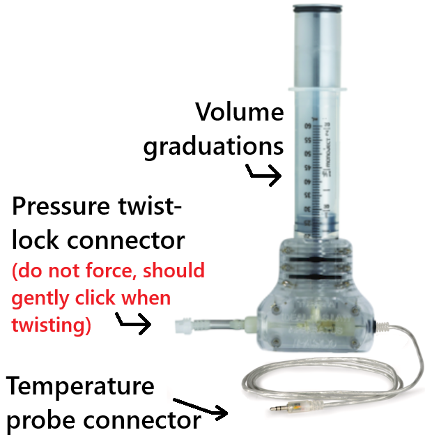 Disconnect the quick-release pressure connector and push the plunger all the way down. Note that the mechanical stop will prevent the plunger from being pushed all the way to the bottom of the syringe. Record the volume reading on the syringe as the volume \(V_{2}\) in your Part 1 Data Table. The value for \(V_{2}\) should be about 20 cc.