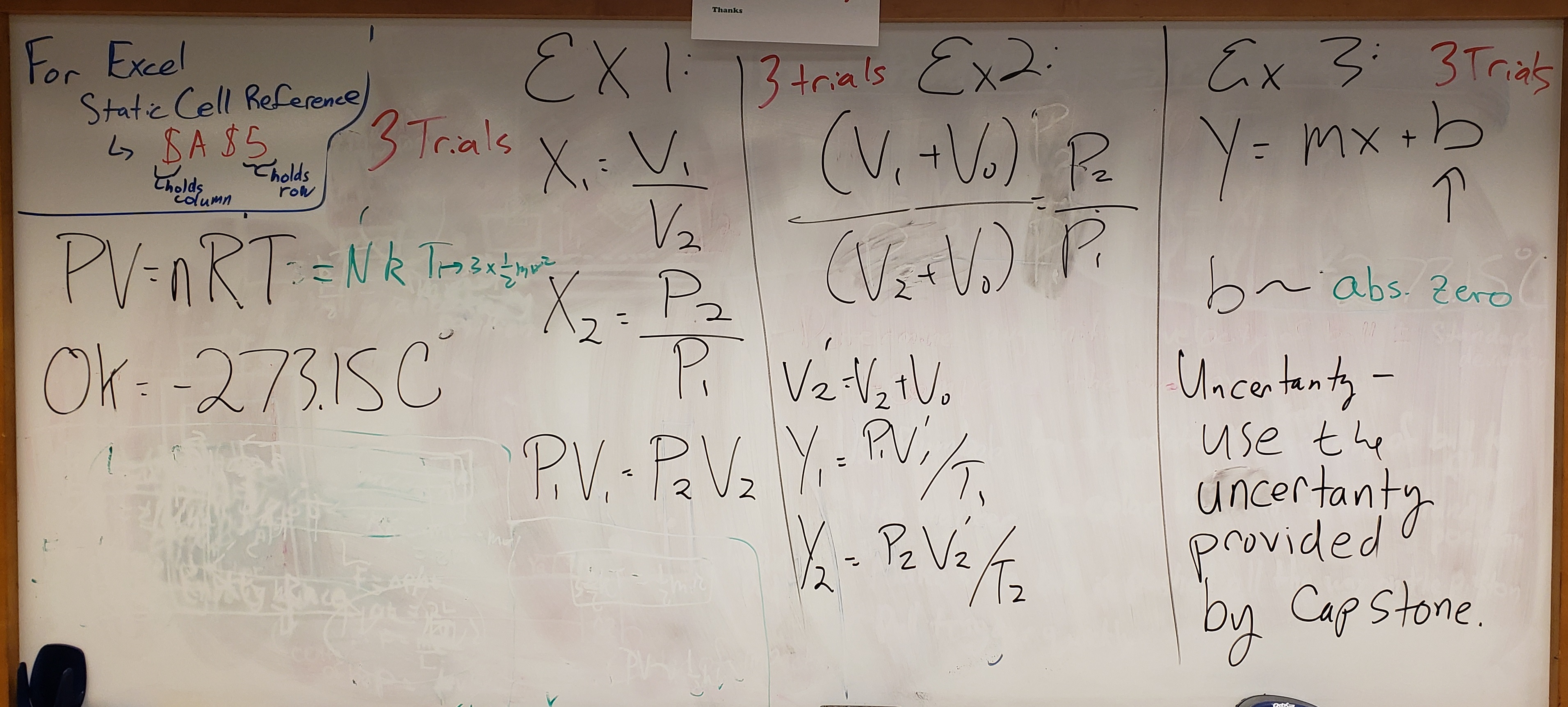 By now you have (hopefully) figured out that you have not accounted for the small amount of volume of air inside the tubing of the apparatus. Using the ideal gas law ((67)) and the data you collected in part 1 you can actually calculate this volume \(V_{0}\) by solving the following equation for \(V_{0}\)