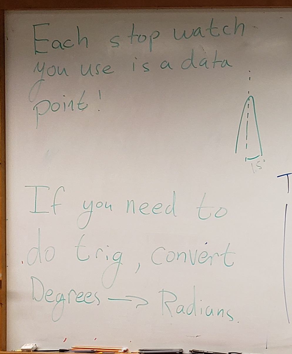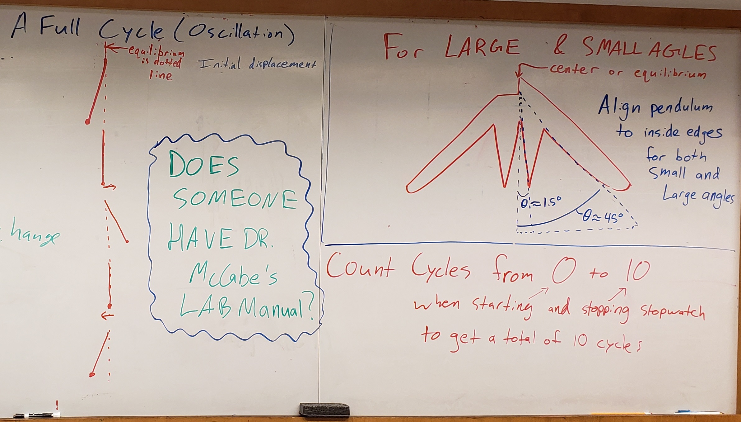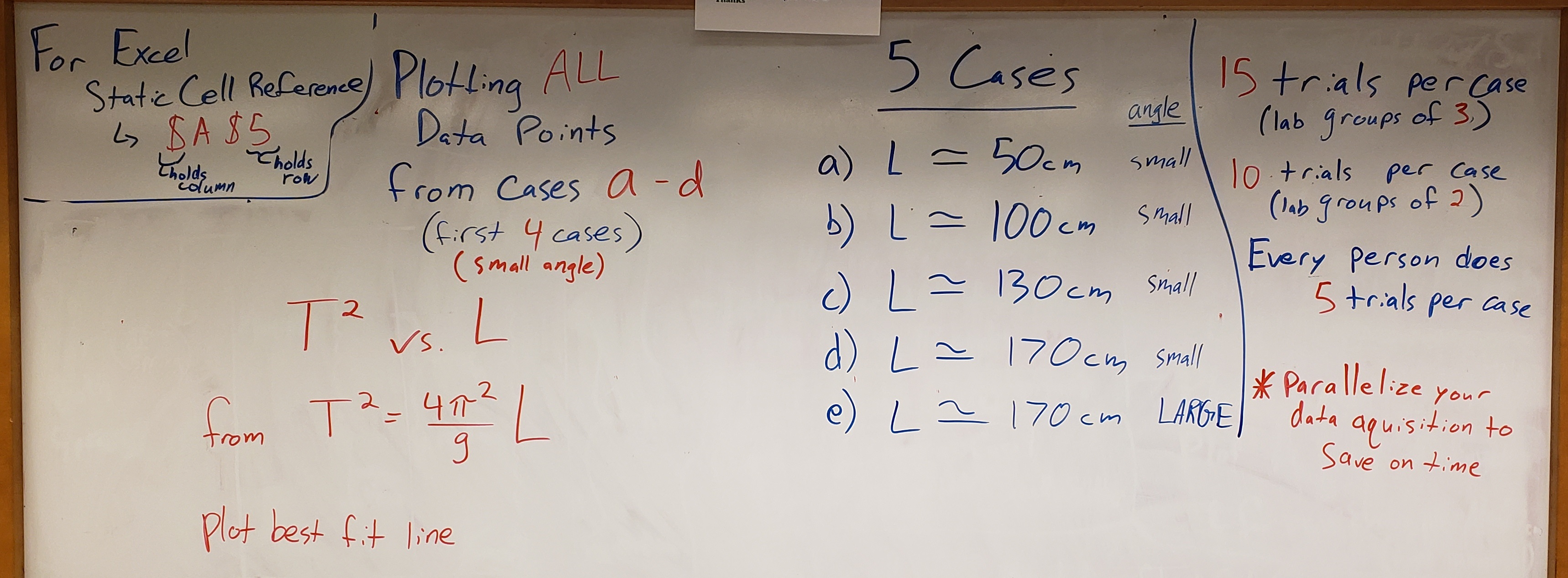 NOTE ON NUMBER OF TRIALS: For each of the five cases, each person will perform 5 time trials. Everyone can record at roughly the same time, but don’t worry if you aren’t all timing the exact same swings (i.e. someone starts a half or whole cycle late); just make sure to time a total of 10 cycles for each trial. By everyone taking data for 5 time trials each, a two-person group will end up with 10 total data points, and a three-person group will have 15 total data points for each case, etc.
