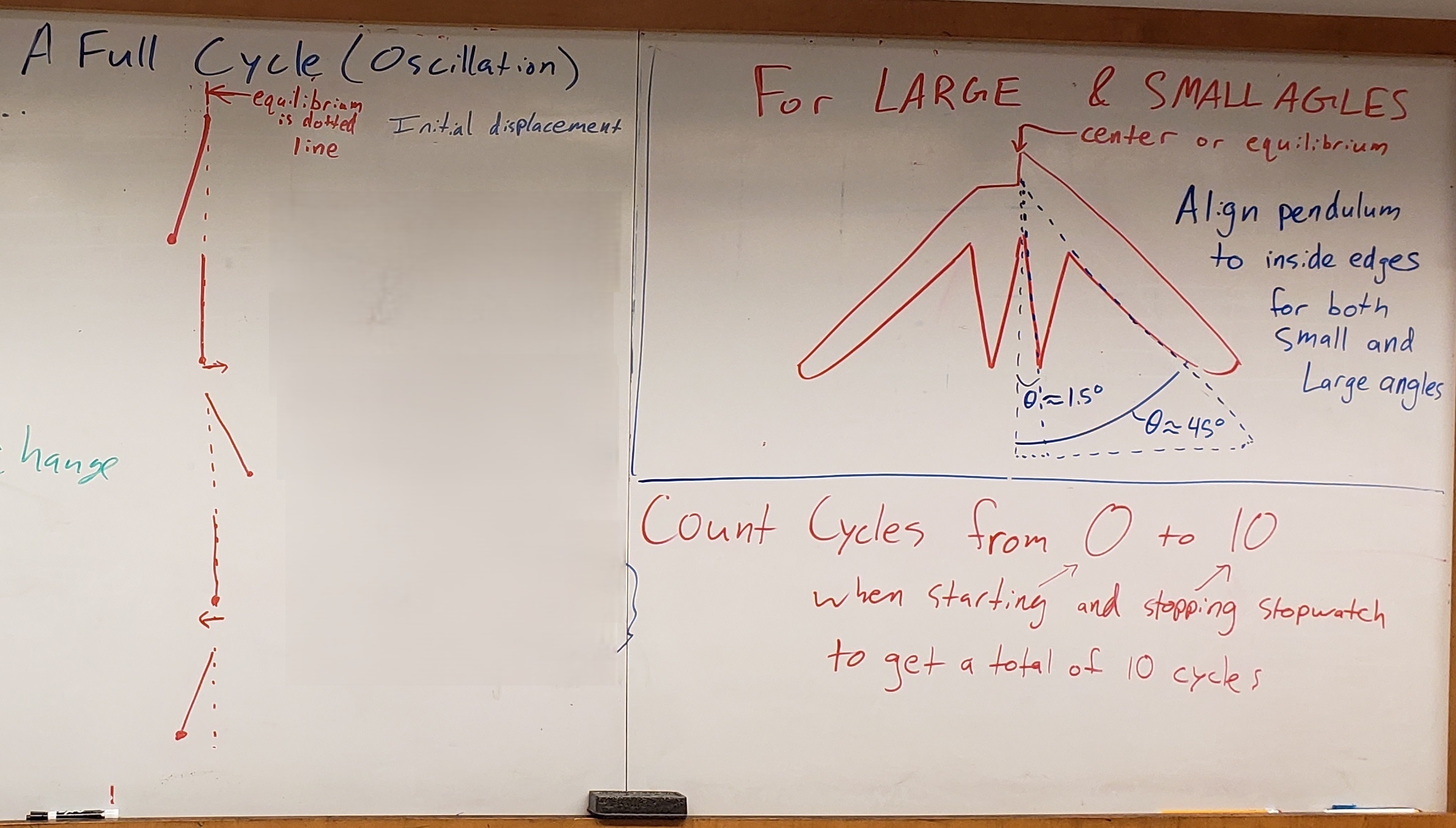 Measure the time \(t_{10\text{cycles}}\) for 10 cycles of the pendulum. One cycle is going from the pendulum’s initial position, swings out, swings back to its initial position. See example in Demo Video: Counting & Small vs. Large Angles.
