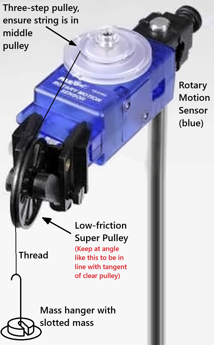 The experiment makes use of a sensor, which is able to detect and measure angular displacement, angular velocity, and angular acceleration. This Rotary Motion Sensor (RMS), with a stated uncertainty of 0.09°, is attached to a vertical rod and has a 3-step pulley affixed to its axle (see Fig. 35). Objects with different moment of inertia can be mounted onto the 3-step pulley and their rotational motion be measured. A second pulley (called a Super Pulley) is attached to the RMS to allow a string to spool off the 3-step pulley as shown in Fig. 35 and Fig. 36. A weight hanger of known mass \(m\) is attached to the free end of the string and provides an accelerating torque to the 3-step pulley and therefore to the object mounted on it.