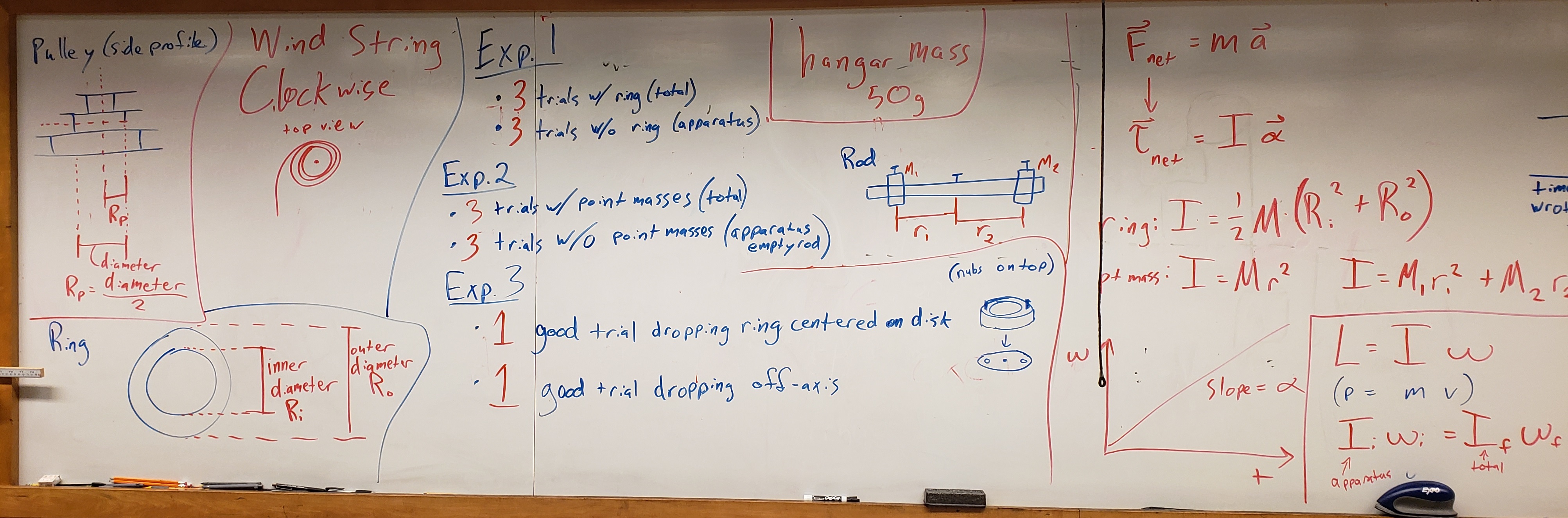 To determine the moment of inertia of the ring subtract \(I_{\mbox{app}}\) from \(I_{\mbox{total}}\). Note your result as \(I_{\mbox{exp}}\) in your Data Table.
