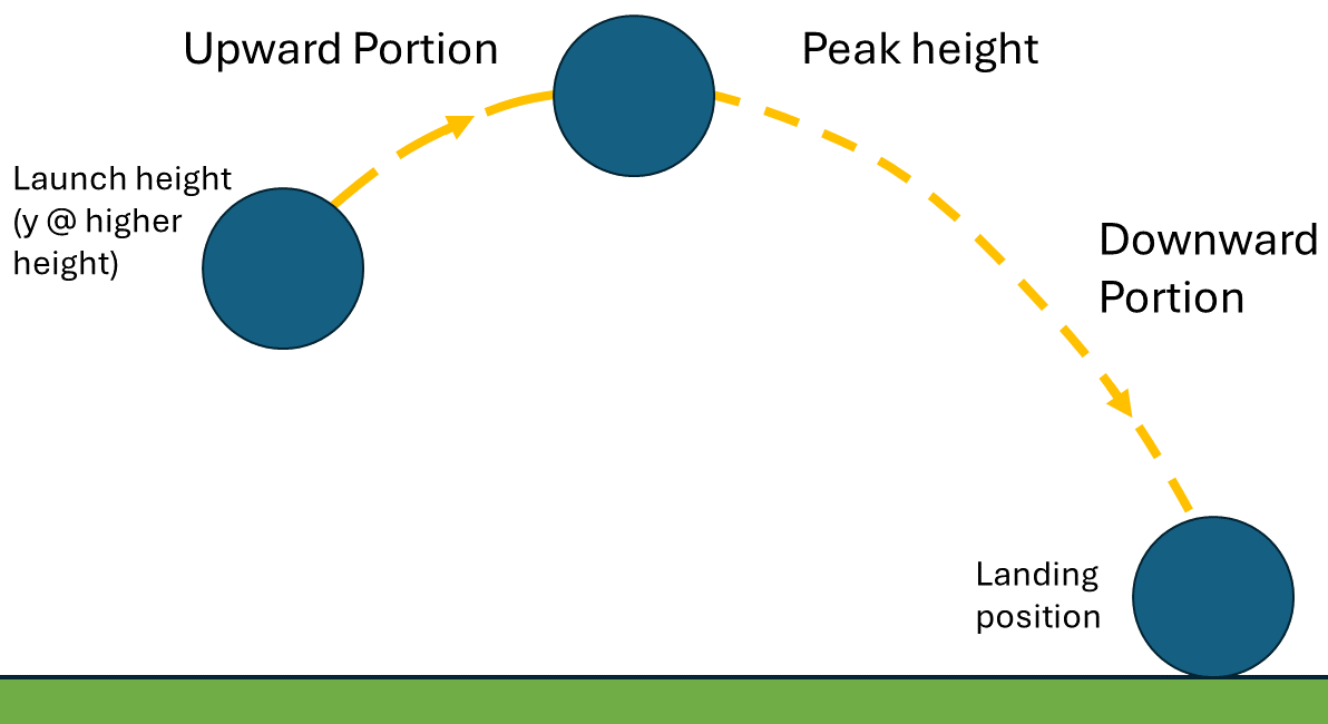 To solve for the time, we can characterize motion in the \(y\) direction to determine for how long the ball is in the air. One way to solve for the total travel time is via the quadratic equation with (36) (not shown here). An alternative method to find the total time can be conducted by breaking the trajectory into parts (i.e. \(t_{\text{case 3}}~=~t_{\text{up}}~+~t_{\text{down}}\) as depicted in Fig. 24) where \(t_{\text{up}}\) is the time for upward travel from launch to the peak height, and \(t_{\text{down}}\) is the time for downward travel to the floor from that peak height.