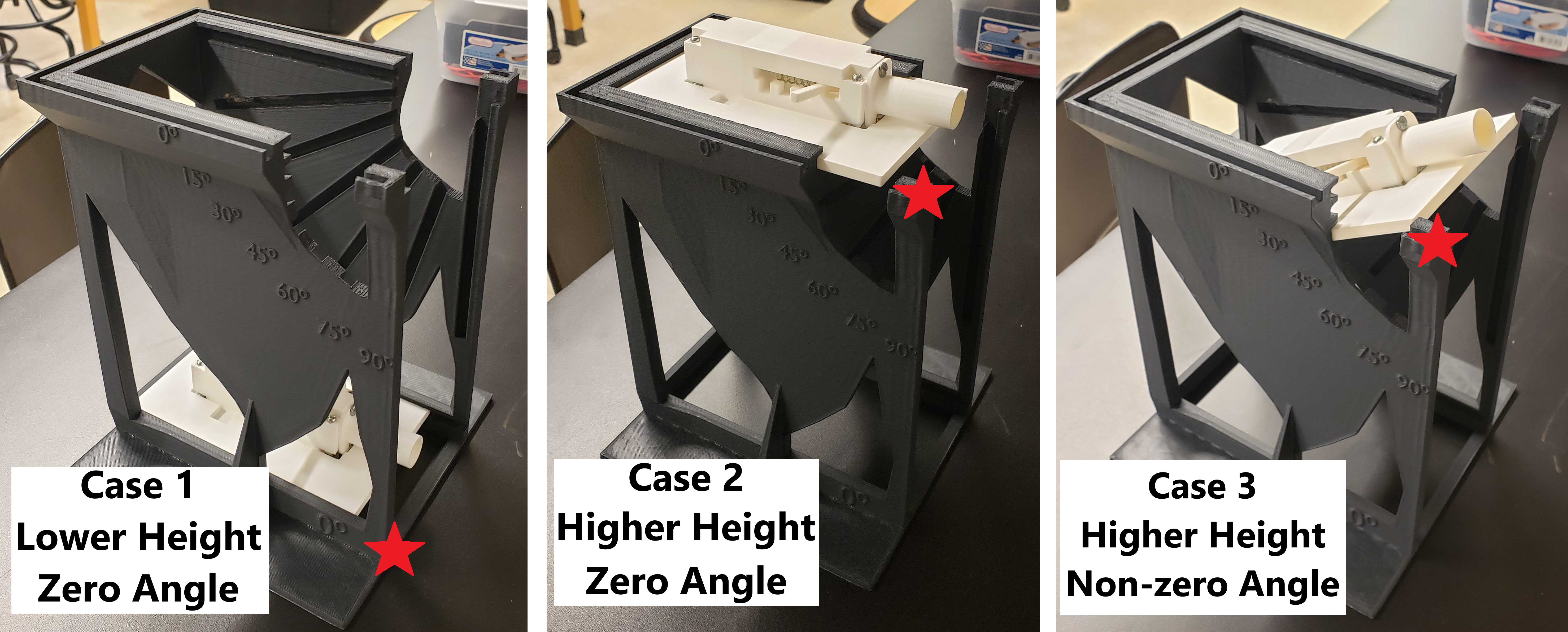 Fig. 21 Stars denote projectile height. Left) Position of launcher for lower height in Case 1. Right) Position of launcher for higher height in Case 2. Right) Position of launcher for angled launches in Case 3 where the ball’s initial position is at the same higher height position.#