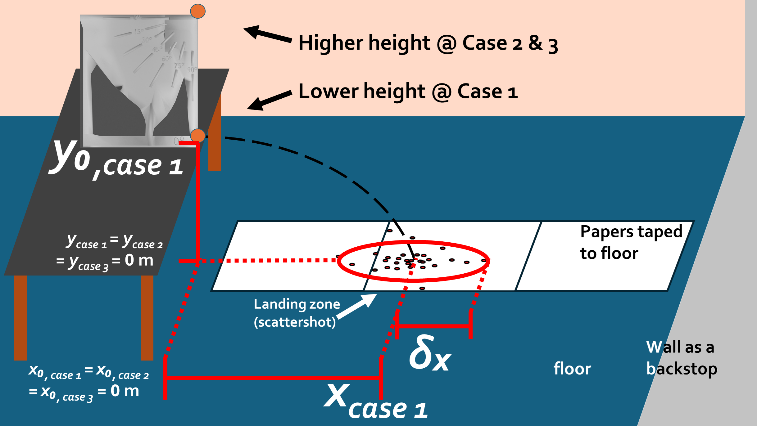We will then launch the ball at Case 2’s height and see how accurate we estimated \(x_{\text{case 2 theoretical}}\). The experimentally determined \(x_{\text{case 2 experimental}}\) will be measured in the same way as in Case 1 (circling and estimating the center of the scattershot).