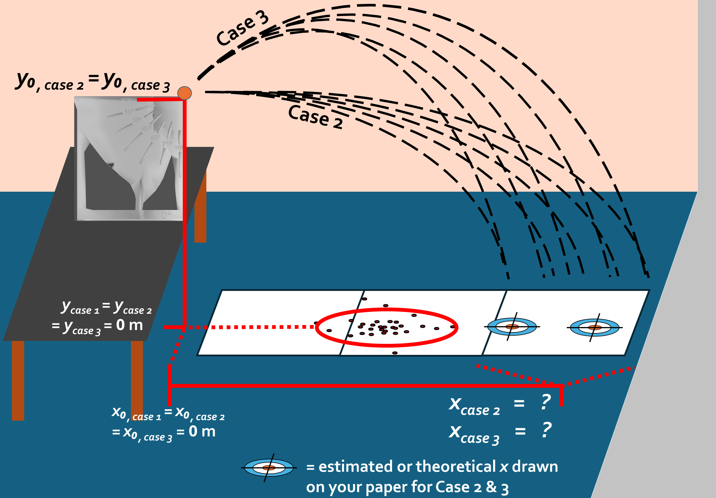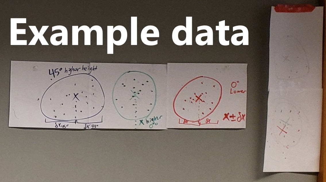 Case 3: Angled launches (\(45^\circ\)) at the same higher height. Calculate the theoretical trajectory (distance \(x\)); place a bullseye at your expected location and compare your experimental landing scattershot to the theoretical distance.