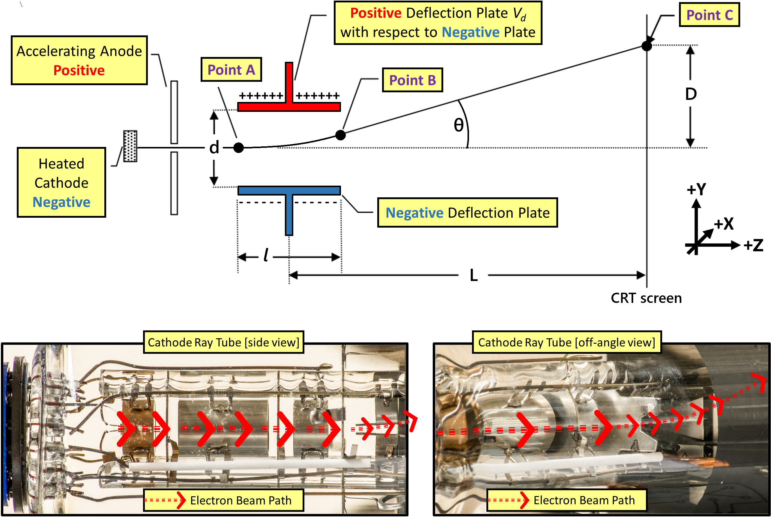 Fig. 91 Top) Schematic of the Electron Path in the CRT. Electron enters deflection parallel plates at Point A, exits at Point B, hits screen at Point C having been deflected distance \(D\) (in the vertical direction for today’s setup). Bottom) Electron beam path through the CRT; after being initially generated by the heater, accelerated toward the screen, brightened by the grid voltage and then focused into a narrow beam, the electrons are deflected up or down as they enter the blackened area of the CRT.#