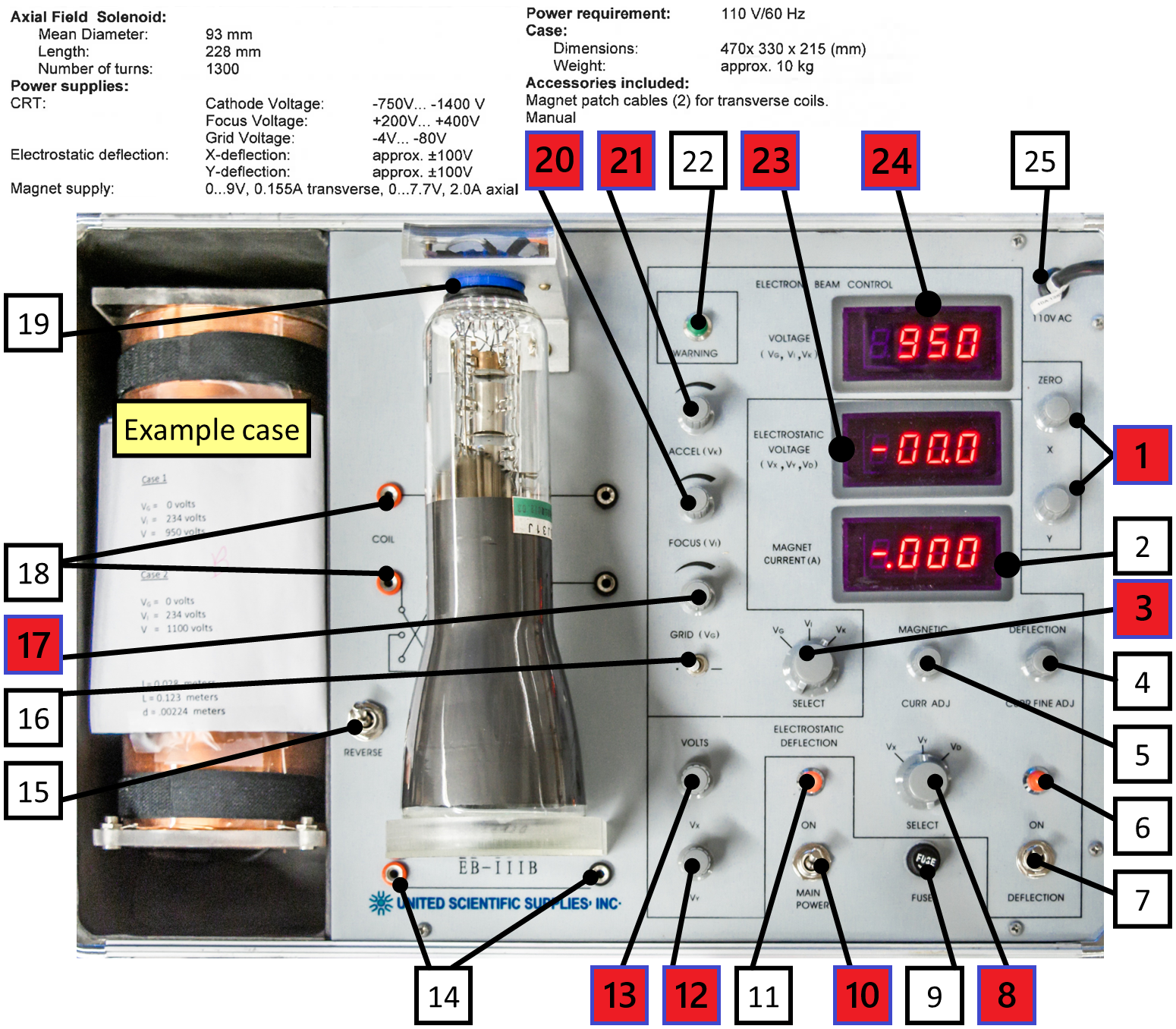 1Knobs for controlling X & Y position without changing voltmeter (for calibrating where you place the origin after zeroing the voltmeters with12&13)3Grid, Focus, Accelerating voltage selector (swap between which of17,20,21appears on top voltmeter24)8X & Y-direction deflection voltage selector (swap between which of12,13appears on middle voltmeter23)12X-direction deflection voltage \(V_\text{X}\) adjustment knob13Y-direction deflection voltage \(V_\text{Y}\) adjustment knob17Grid voltage \(V_\text{G}\) adjustment knob20Focus voltage \(V_\text{I}\) adjustment knob21Accleration voltage \(V_\text{K}\) adjustment knob (acceleration in Z direction)23Voltmeter display for12or13(depending on selection with8)24Voltmeter display for17,20, or21(depending on selection with3)