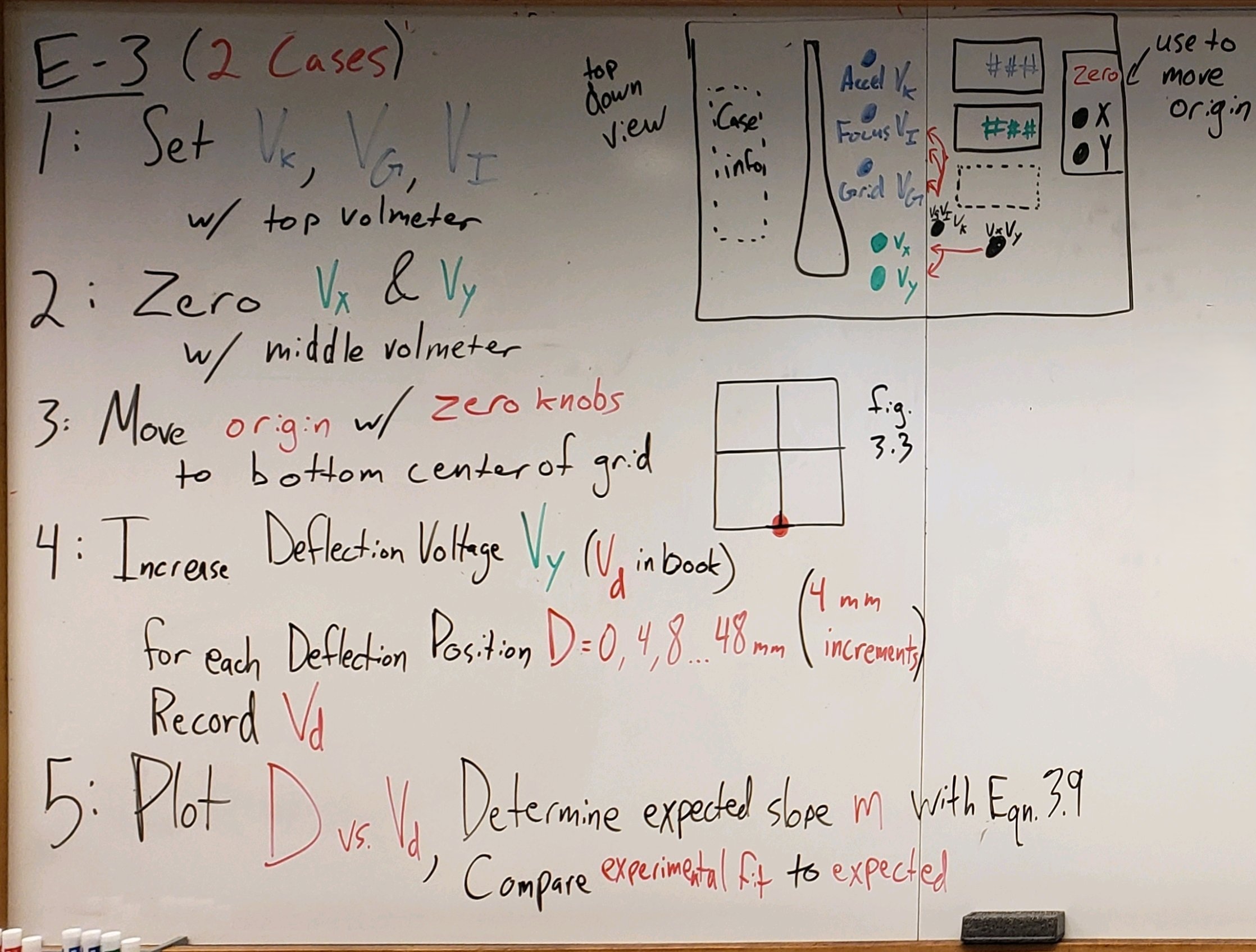 In this experiment, you will first set up the grid/focus/acceleration voltages to those listed for each case on the paper inside the apparatus. The X/Y-deflection voltages will be set to zero. The electron beam on the screen can then be moved to the origin with the zeroing knobs. Then the electron deflection in the Y-direction can be measured with the on-screen grid when applying differing amounts of deflection voltage. Then plot \(D\) vs. \(V_d\) and compare to expected values.