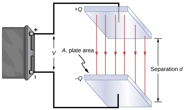 Consider such a parallel-plate capacitor with plate area \(A\), separation \(d\), and an applied potential difference \(V\). When a voltage is applied, equal and opposite charges \(\pm Q\) accumulate on the plates, producing a surface charge density