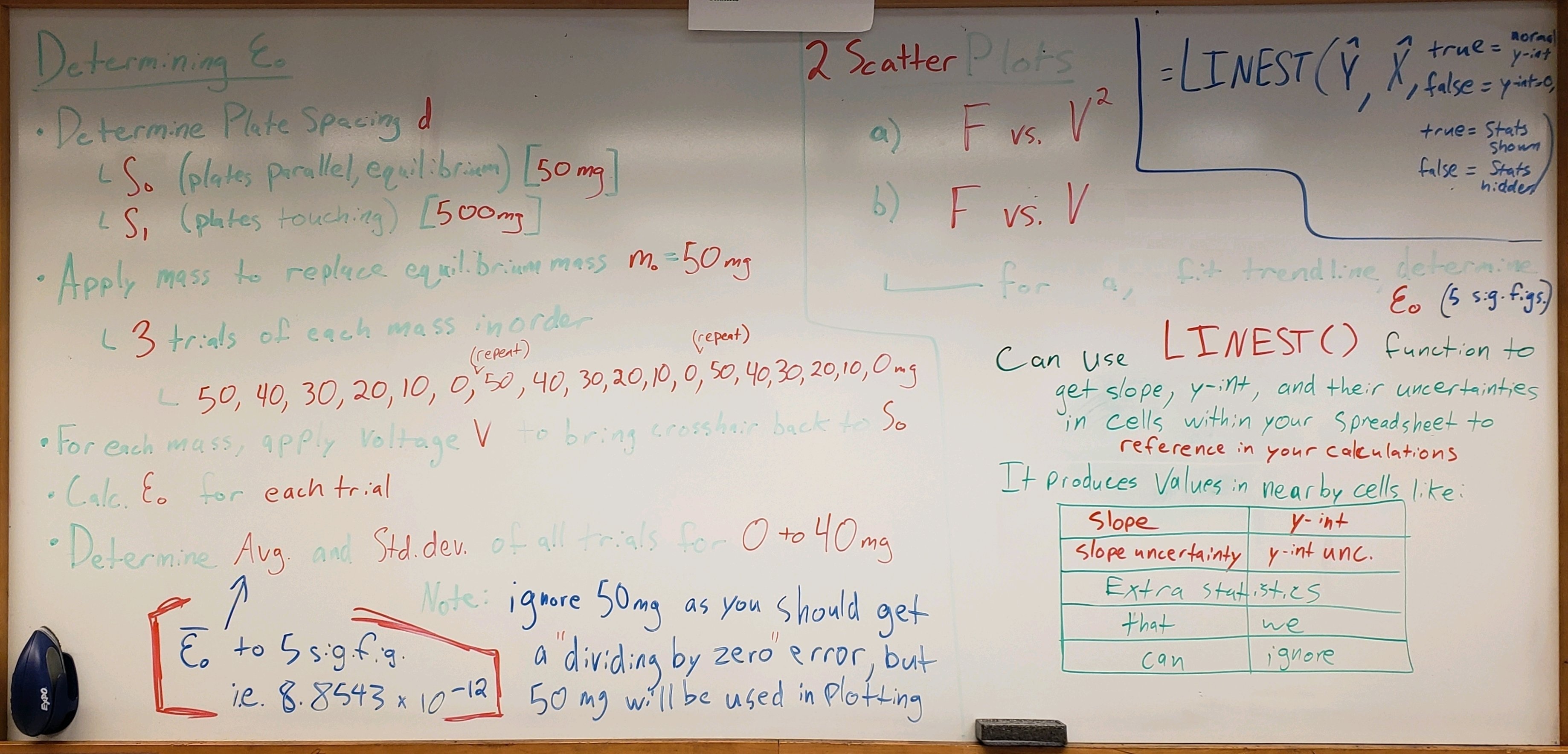 Determine \(\varepsilon_0\) from plotting of all your data (including equilibrium mass) as \(F_E\,\text{vs.}\,V^2\)