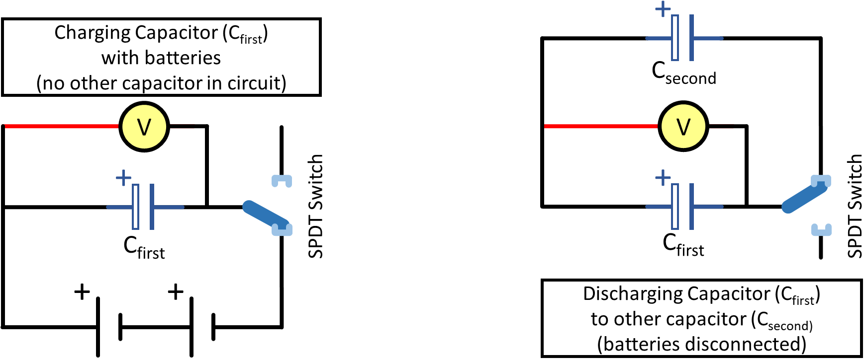 Note: Initial voltage is \(V\) when the battery is connected to \(C_\text{first}\) before you throw the switch to connect the capacitors together. Final voltage is \(V\) after you throw the switch to connect \(C_\text{first}\) with \(C_\text{second}\) and allow the charge in the