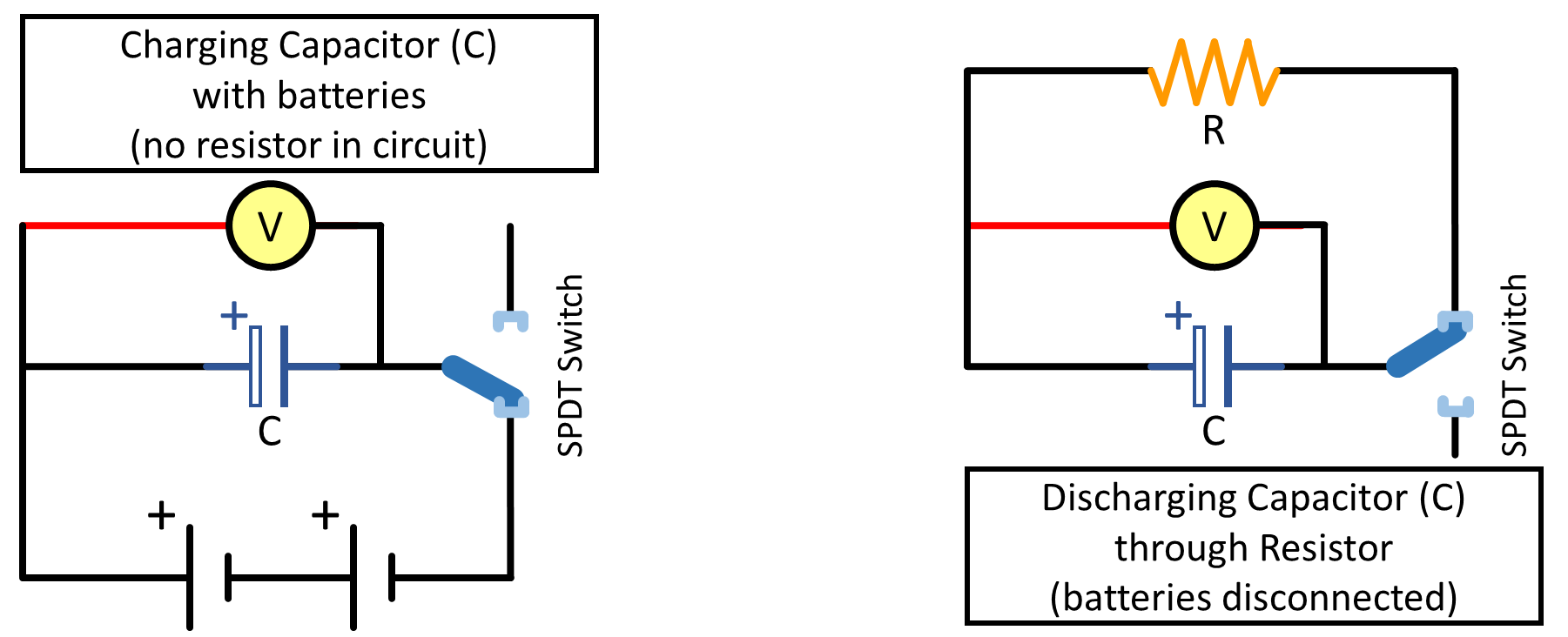 firstposition (bottom circuit when charged-by-batteries) and then replacing the resistor with the higher-capacitance \(C_1\) in thesecondposition (top circuit when charged by the first capactior). Ensure the voltmeter is still connected as before (either side of thefirstposition) and continue using the same Voltage vs. Time plot in Capstone.Create a data table including: