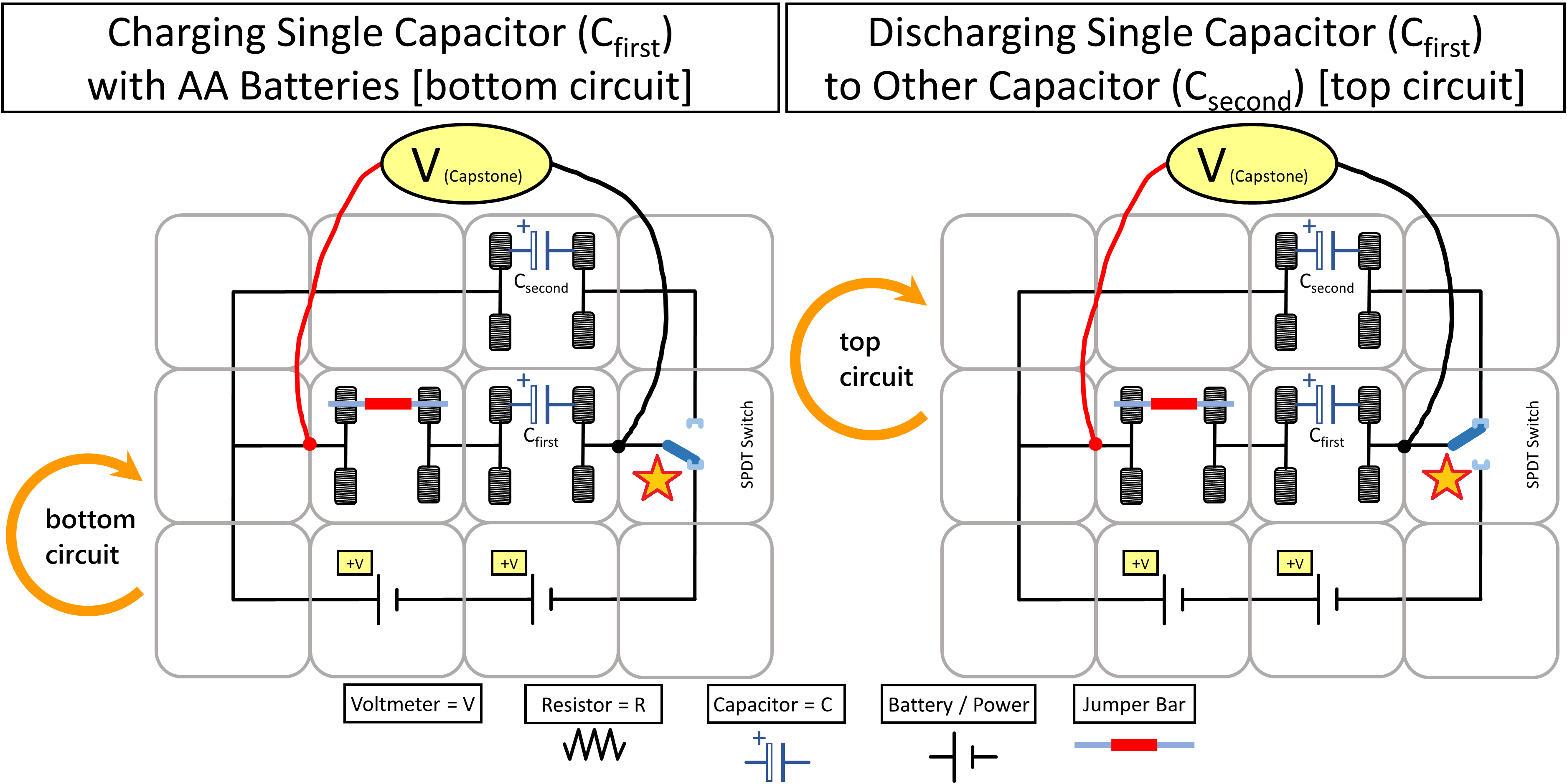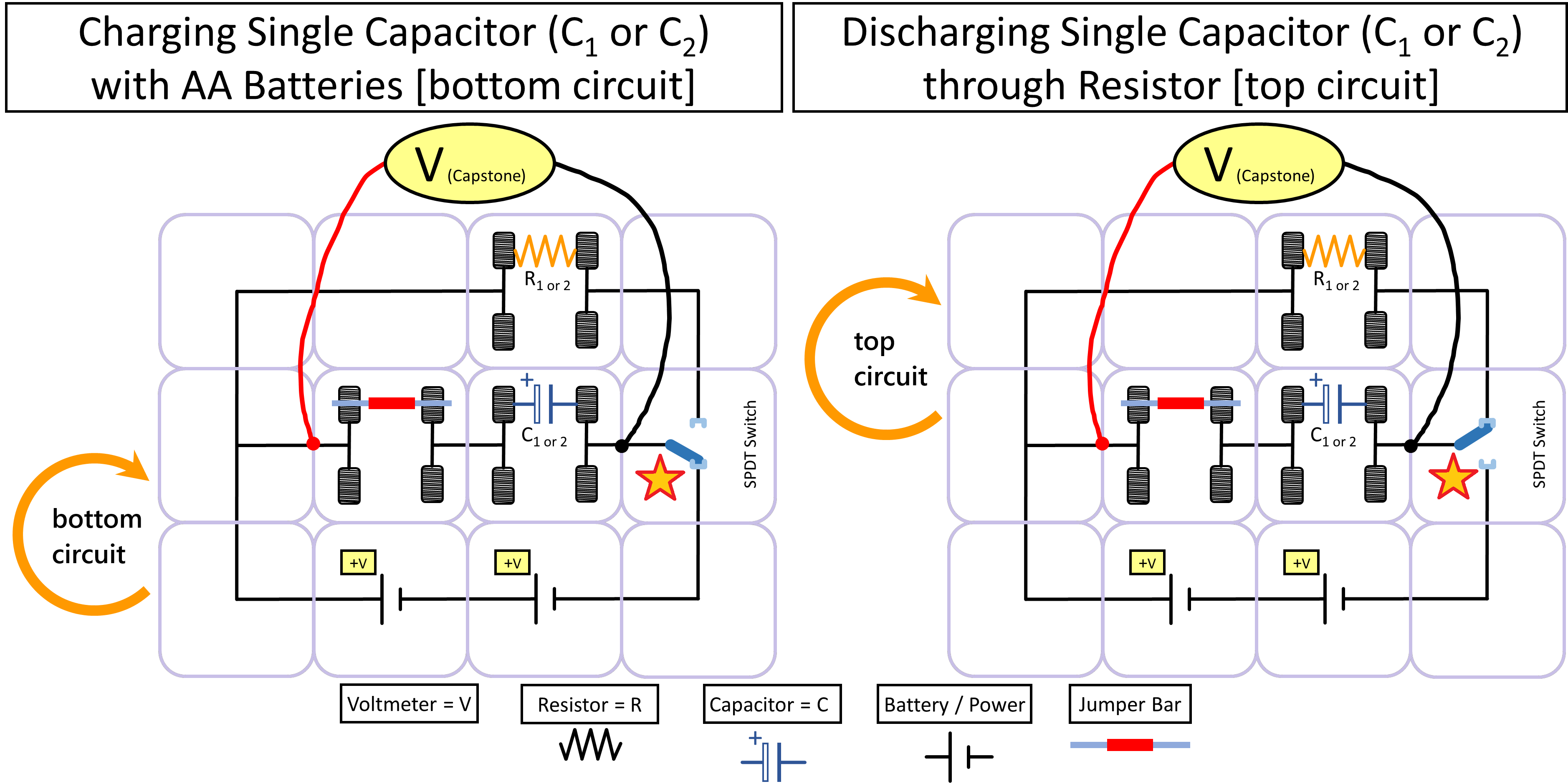 • Capstone voltmeter (Connected across capacitors using alligator clips on jumper bars) |