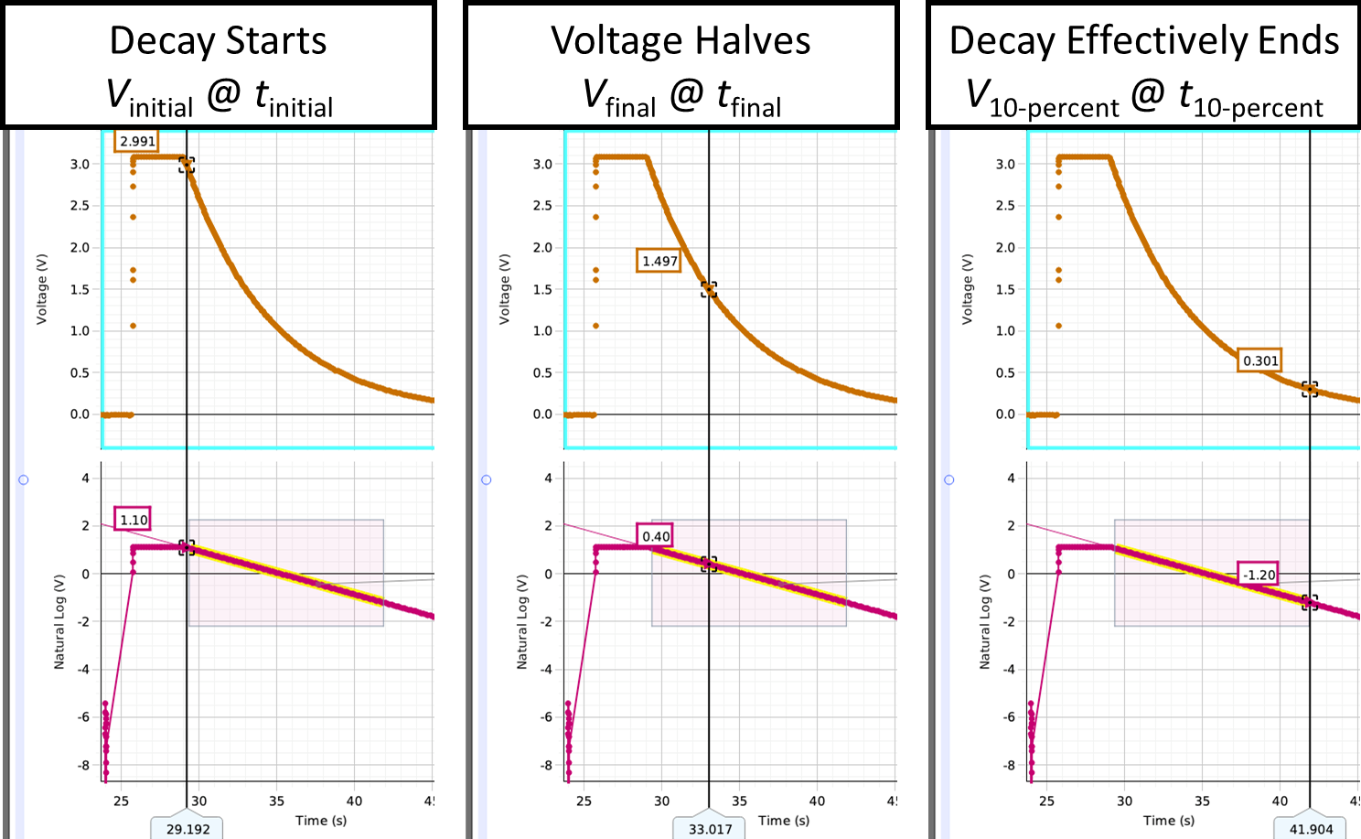 Fig. 109 Example Voltage vs. Time plot (top) and LN(V) vs. Time plot (bottom). Left) Time of start of a decay trial. Center) Time when half of the initial voltage is reached (i.e. after a half-life or \(t_1/2\)). Right) Time of the effective end of a decay trial when voltage drops to 10% of initial voltage (i.e. when \(V = V_\text{10-percent}\).)#
