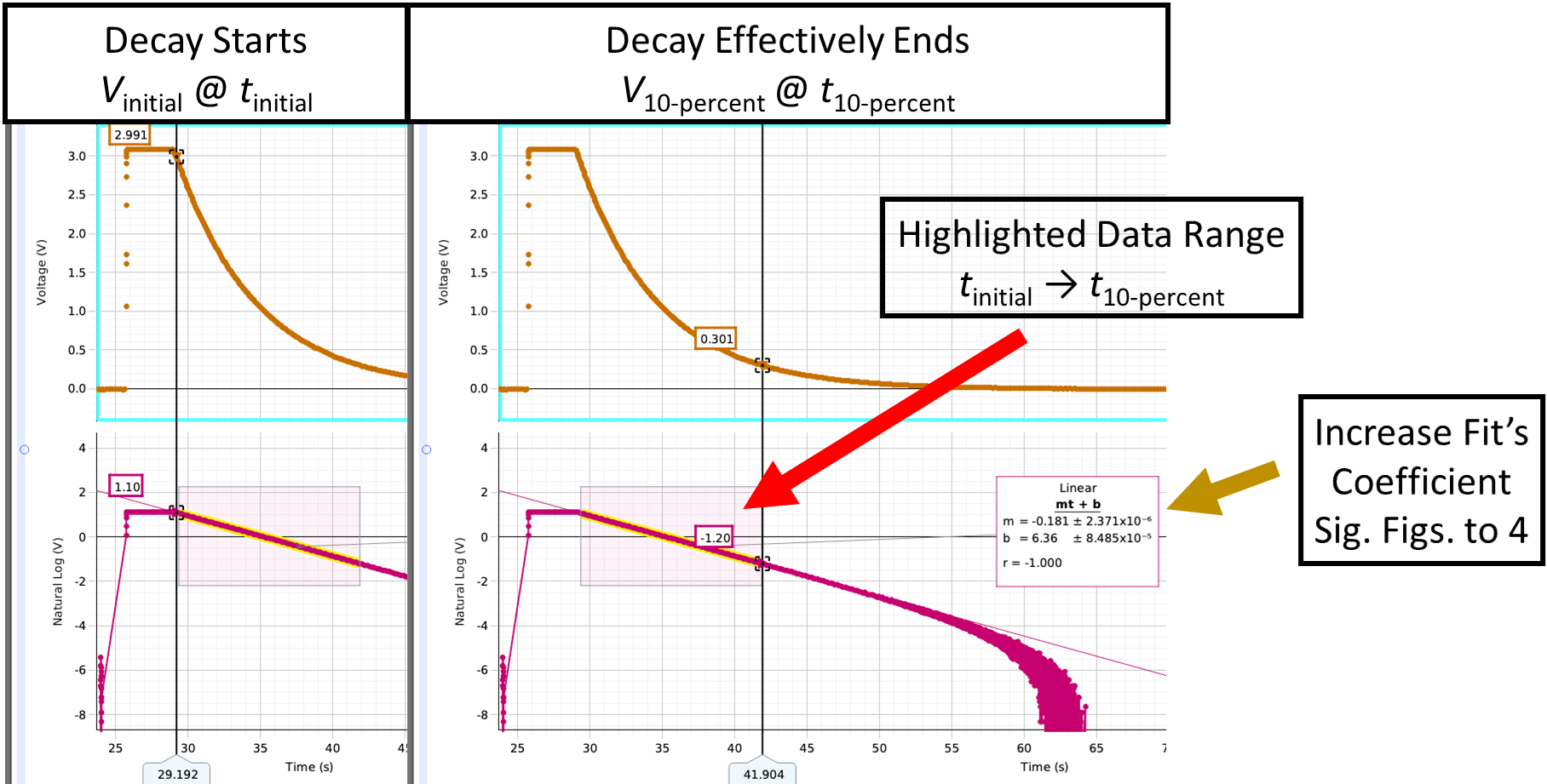 Fig. 110 Example Voltage vs. Time plot (top) and LN(V) vs. Time plot (bottom). Left) Time of start of a decay trial. Lower bound of data-highlight box for fitting data in LN(V) vs. Time plot. Right) Time of the effective end of a decay trial when voltage drops to 10% of initial voltage (i.e. when \(V = V_\text{10-percent}\) and upper bound of data-highlight box.)#