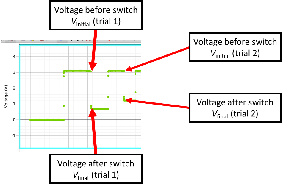 From the \(V\) vs. \(T\) plot, record for each of the trials the initial voltage before charge is distributed and final voltage after the charge is distributed between the capacitors (notice the near immediate change). Examples are shown in Fig. 112.