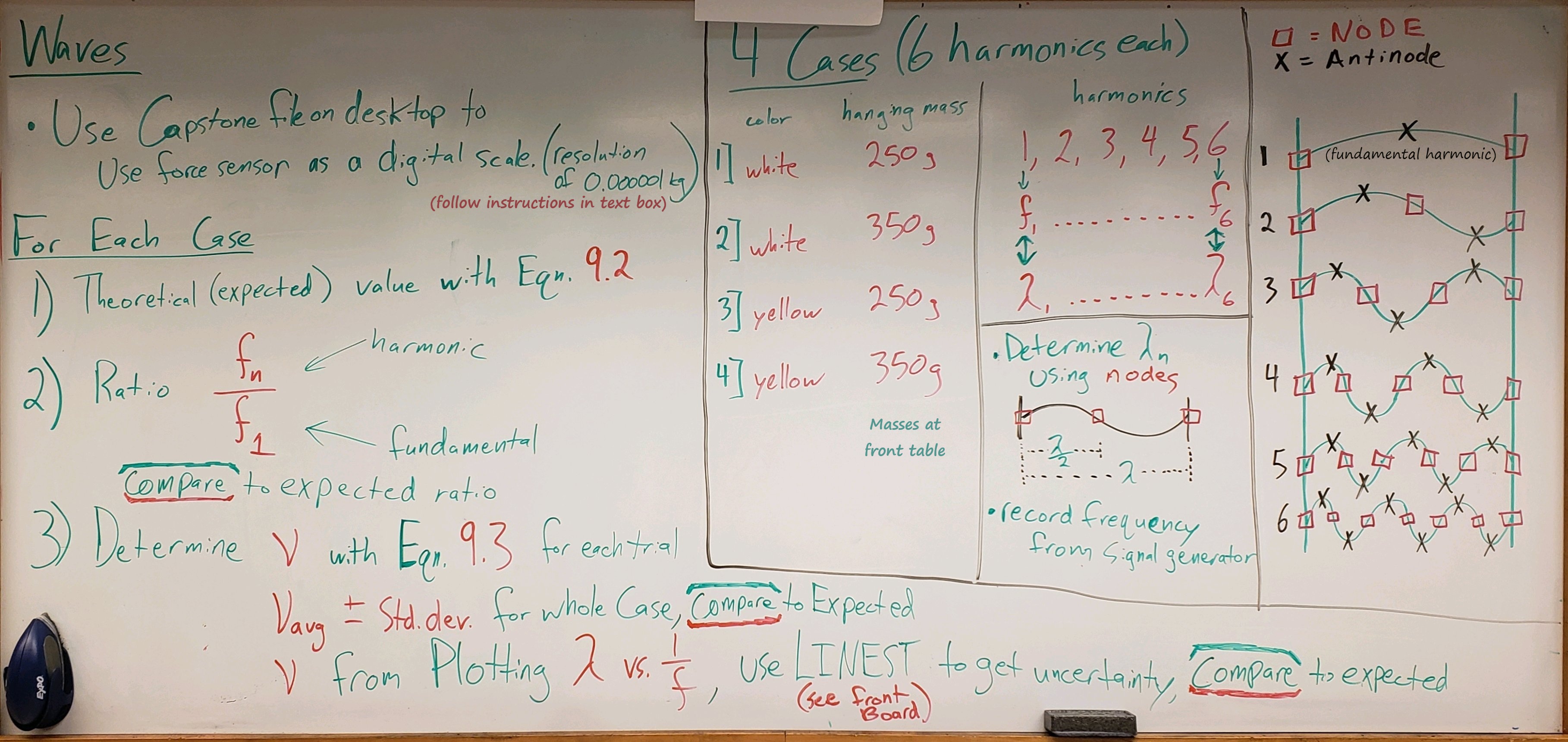 Create a common data table for each case with the hanging mass, the tension, the string linear density, and the calculated propagation velocity. Create a data table for the current case with columns for harmonic number (\(n = 1, 2, 3, 4, 5,\) and \(6\)) the measured wavelength \(\lambda_n\), the measured frequency \(f_n\), the ratio \(f_n/f_1\) of the frequency to the fundamental and the velocity \(v_n=\lambda_n f_n\).