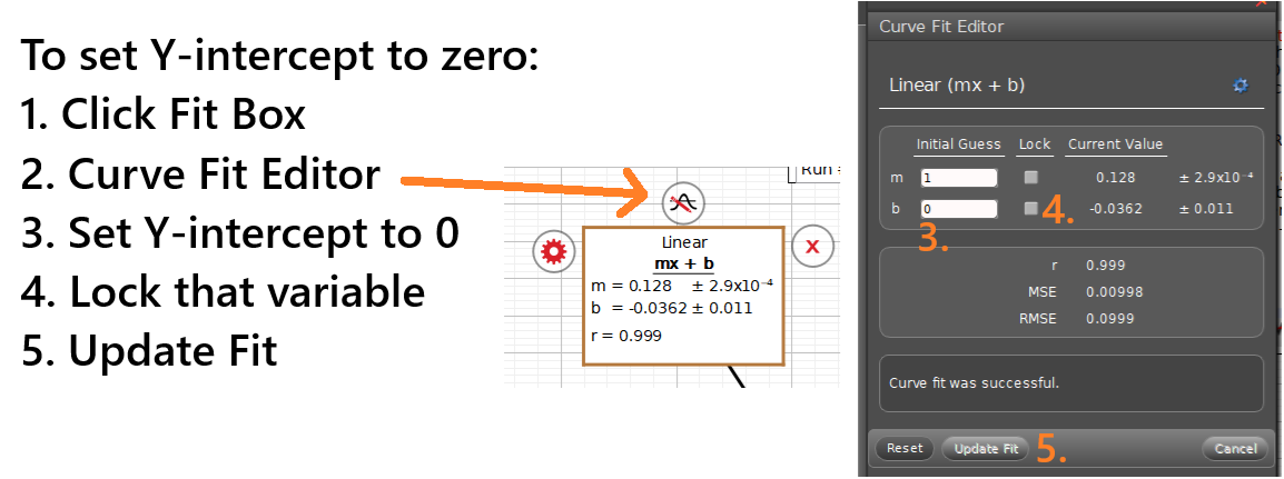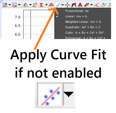 Fig. 10 Capstone process for updating the y-intercept of a linear fit. Bottom) The fit tool can be both enabled/disabled by clicking the main area of the button. Then, the little black arrow provides a dropdown menu with many fit options you from which you can choose.#