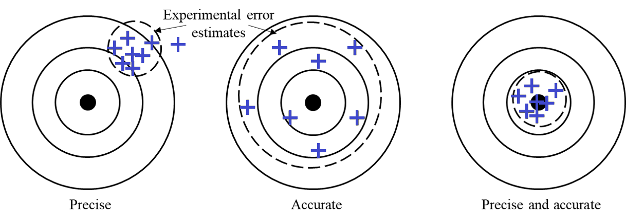 The two types of errors illustrated in Fig. 4 require different treatment. The systematic errors illustrated on the target labelled Precise cannot be reduced by taking more measurements, while the average value obtained with the random errors on the target labelled Accurate improves with more measurements. The following sections provide guidance on analyzing systematic and random errors.