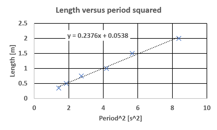 Fig. 6 shows again the length as a function of the period squared for a pendulum with a linear trendline. The line is the best fit to the points and the equation shows the resulting slope and intercept. Theoretically the intercept is expected to be zero, and the slope is excepted to be \({4\pi^2}/{g}=0.248\,\text{s}^2/\text{m}\). In Excel you can set the equation properties to force the intercept to zero. Often you need to reformat the displayed equation to show enough significant figures.