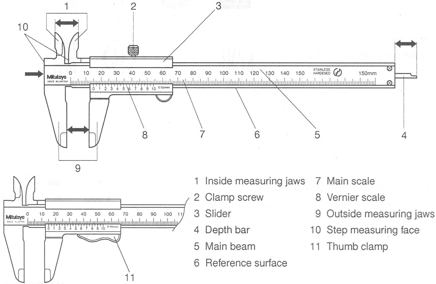 Fig. 5 A diagram showing Vernier calipers and their main measurement scales. The secondary insert shows other version of calipers we have with a thumb clamp instead of a clamping screw.#