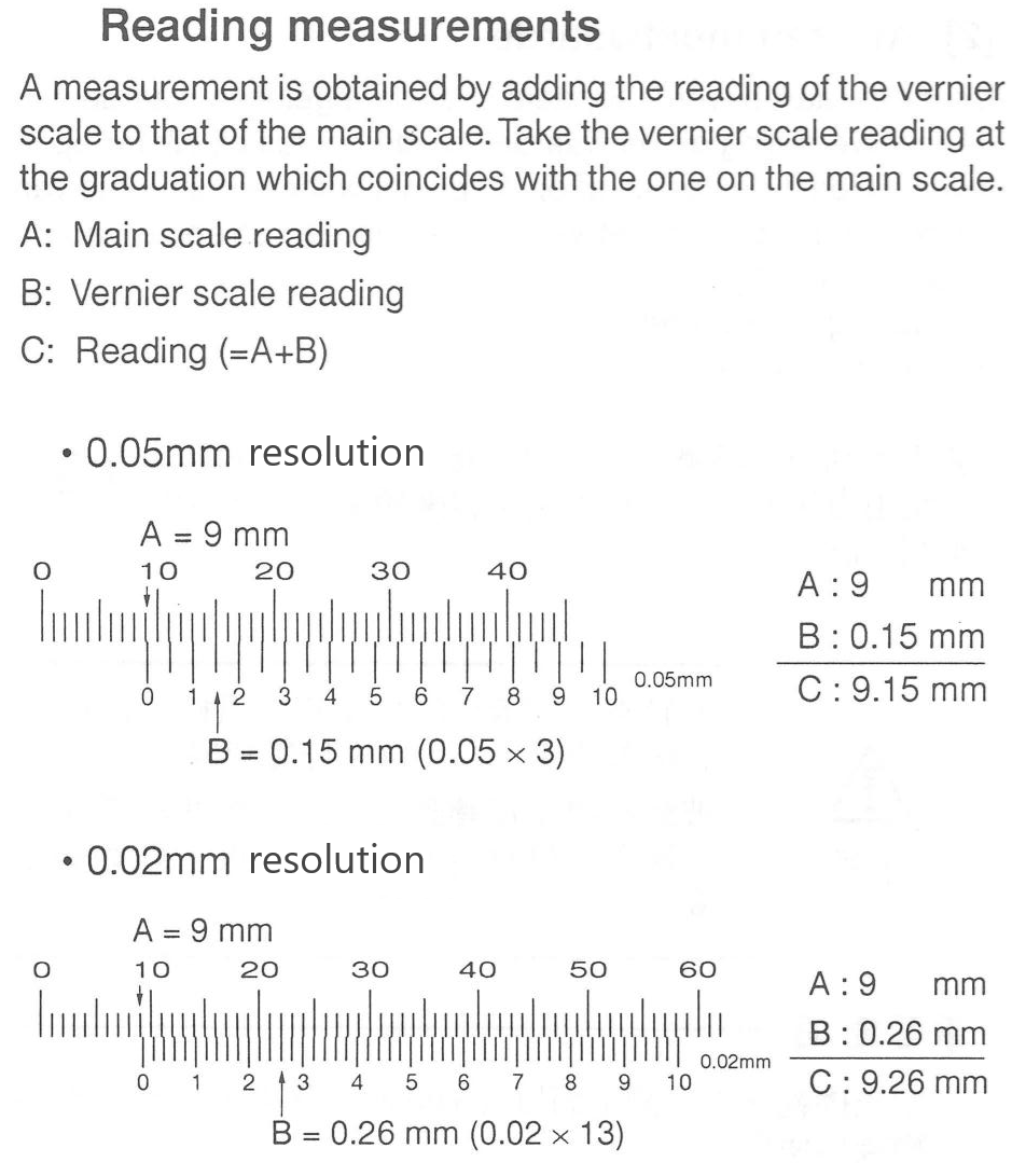 Fig. 6 A diagram showing two examples of reading measurements from Vernier calipers. Top) 0.05 mm resolution caliper example, Bottom) 0.02 mm resolution caliper example.#