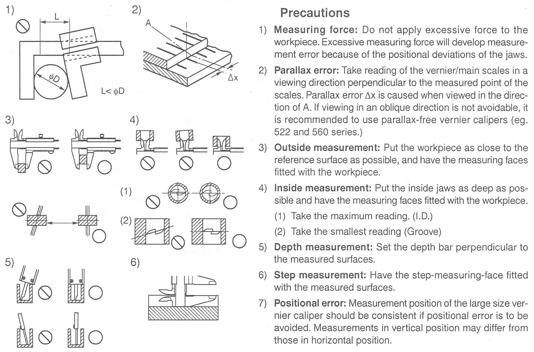 Fig. 7 A diagram showing precautions necessary for successful use of Vernier calipers.#