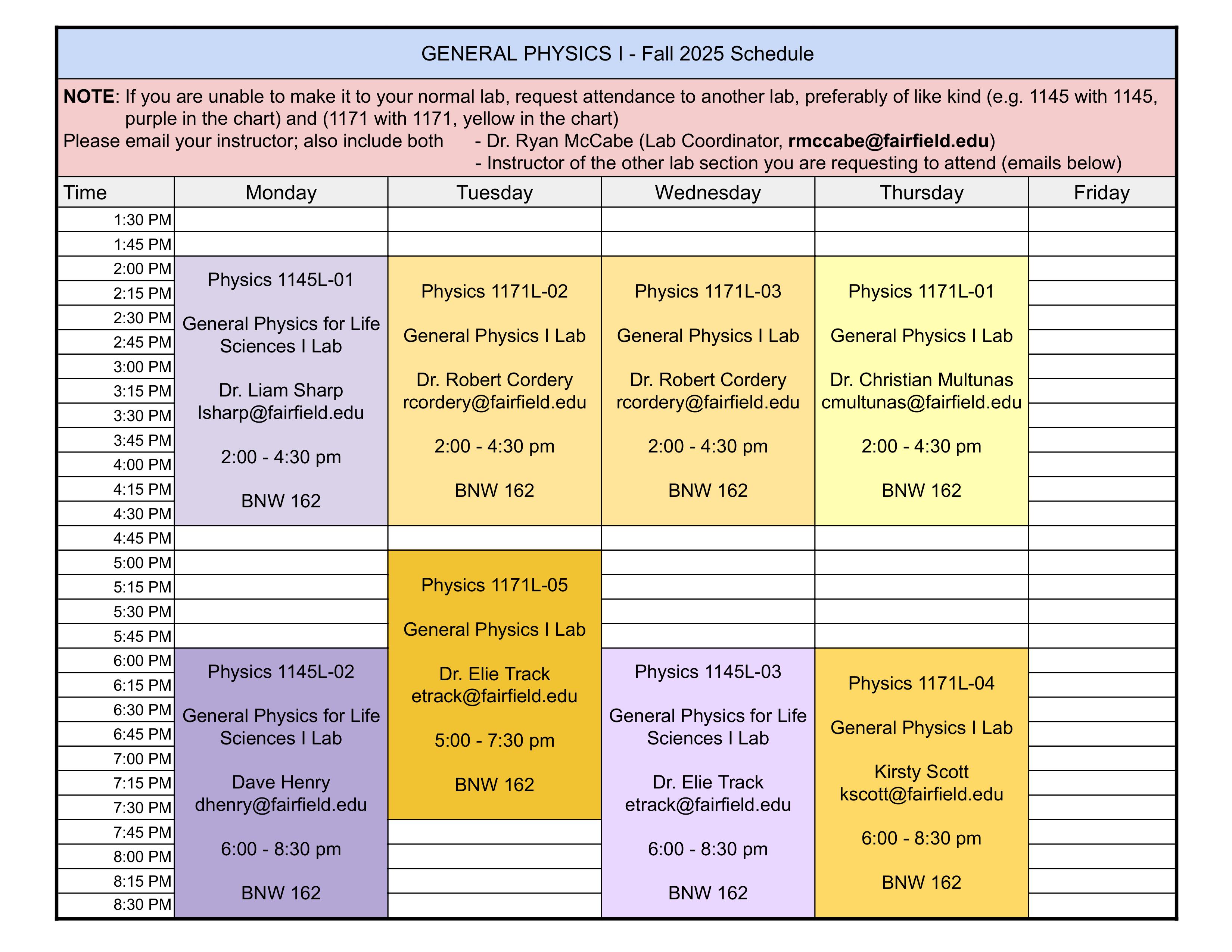 Fig. 3 Lab schedule by section for PHYS 1145 & 1171. Included are the professors’ email addresses.#